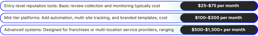 Reputation management software pricing depends on your company’s size, number of locations, and the number of review platforms you manage. Some tools focus on collecting reviews, while others incorporate advanced features such as sentiment analysis, social listening, and automated responses. The more integrations you need with CRM, surveys, and reporting, the higher the overall cost.