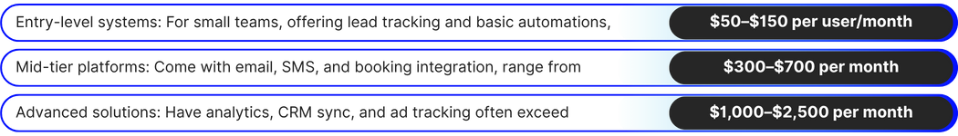 Sales funnel software pricing depends on features, automation depth, and integrations, as well as your locations, number of users, monthly lead volume, and messaging needs. Costs also vary by whether you include text and email automation, call tracking, landing pages, calendar booking, and native CRM sync with role-based permissions.