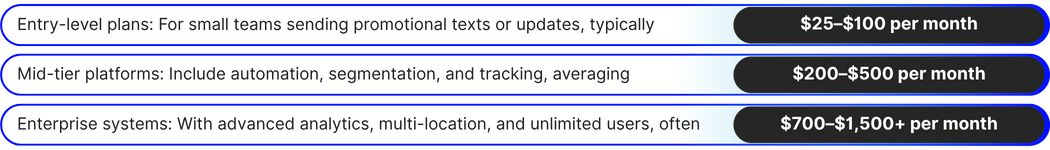 Pricing depends on contact volume, automation features, and whether your plan includes campaign reporting, CRM integration, review monitoring, or multi-location support. Costs also vary based on text volume, number of users, and included analytics tools.