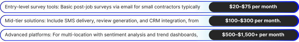 Most survey tools charge monthly per user or location, with optional fees for SMS sends, automation, and review platform integrations. Pricing depends on the number of users, survey volume, and advanced analytics features.