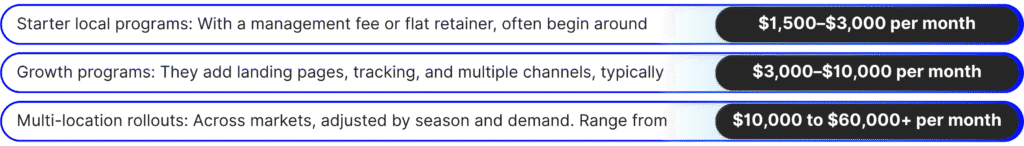 Budgets depend on your trade, city, and goals. Most contractors start with local search and LSA, then layer Meta or YouTube for retargeting.