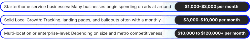 Pricing depends on your market, services, and channels (Google Search, Local Services Ads, Performance Max, Meta, YouTube). Most agencies quote after a brief audit. Use these planning ranges grounded in current benchmarks: